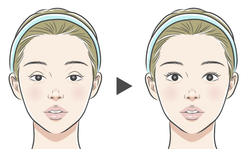 瞼の下がりに対し、眉を持ち上げて目を開こうとする(額に力が入る)状態から目の力だけでしっかりと開けられるようになるため、額のしわ軽減やその他の症状の改善にも繋がります。
